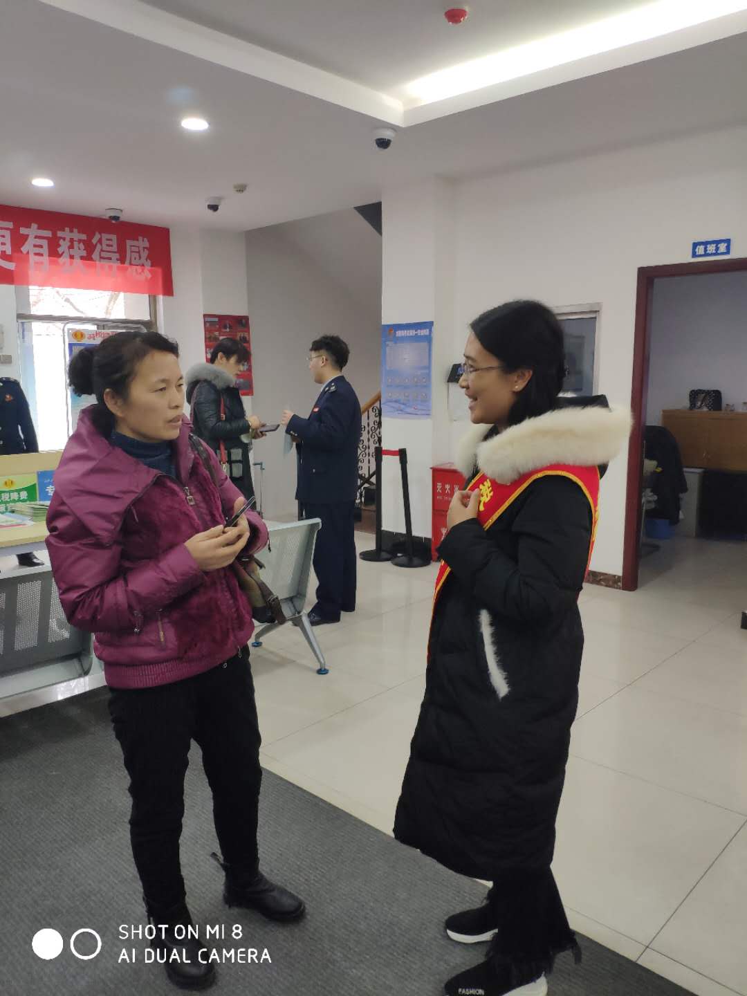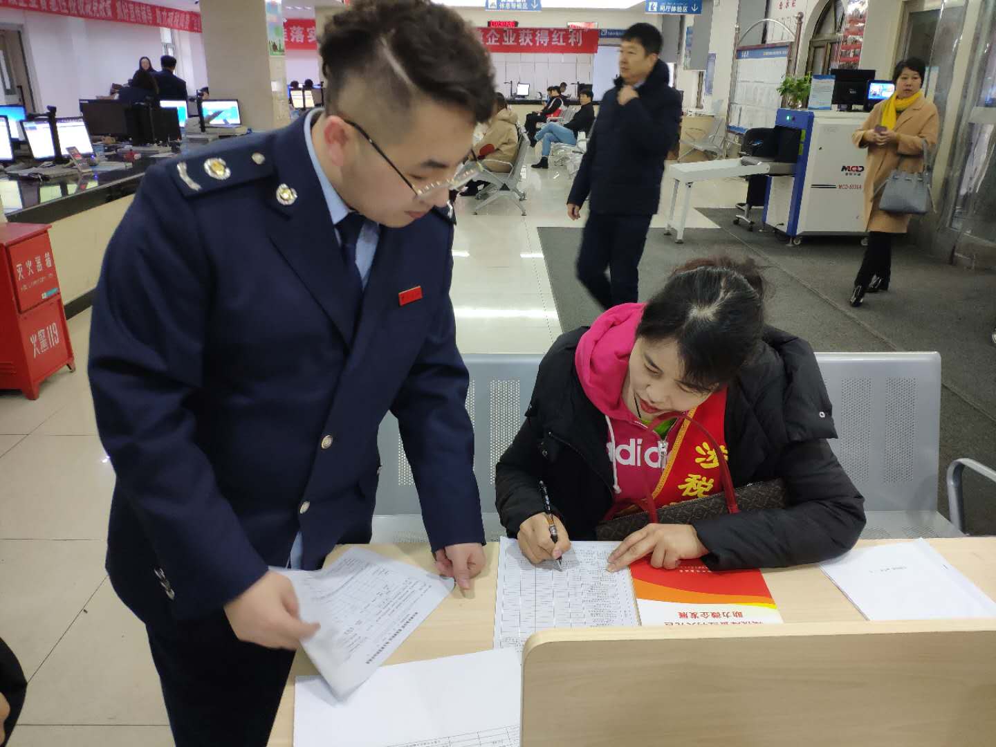 圖一:中稅科信稅務(wù)師事務(wù)所志愿者徐梅霞正在和稅局工作人員溝通志愿服務(wù)工作內(nèi)容